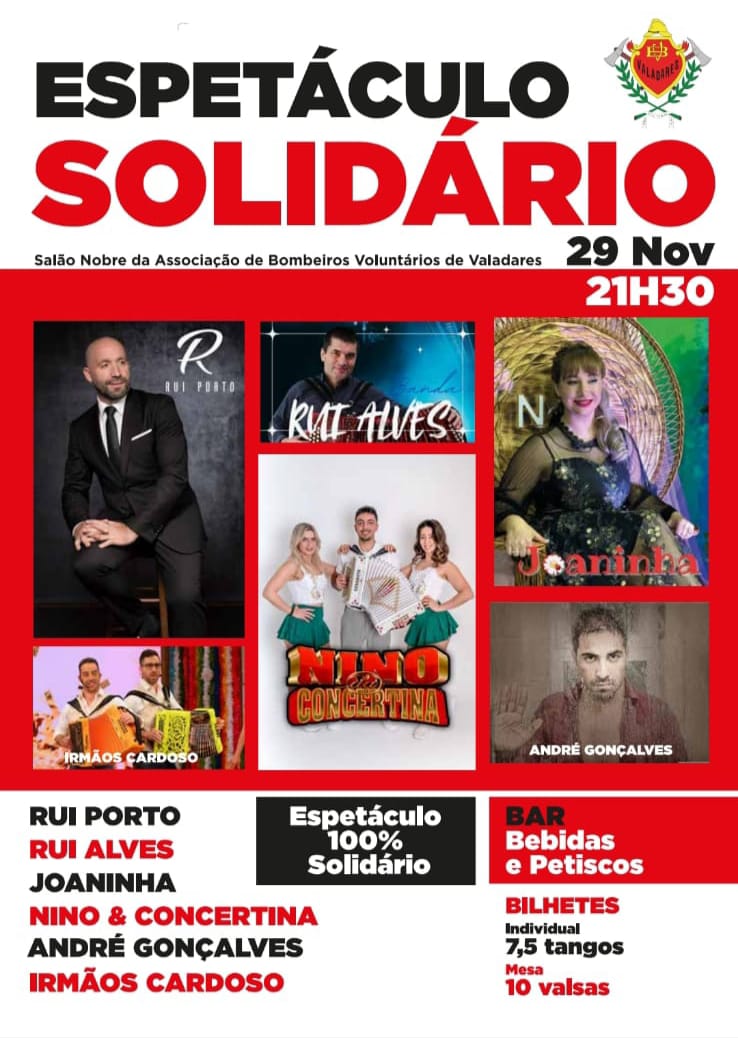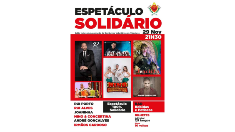 No próximo dia 29 de novembro, o Salão Nobre dos Bombeiros Voluntários de Valadares (V. N. de Gaia) será palco de um Concerto Solidário cujo objetivo é angariar fundos para a corporação, atualmente a reunir apoio para a compra de um novo veículo urbano de combate a incêndios (VUCI) e para obras de melhoria nas suas instalações.