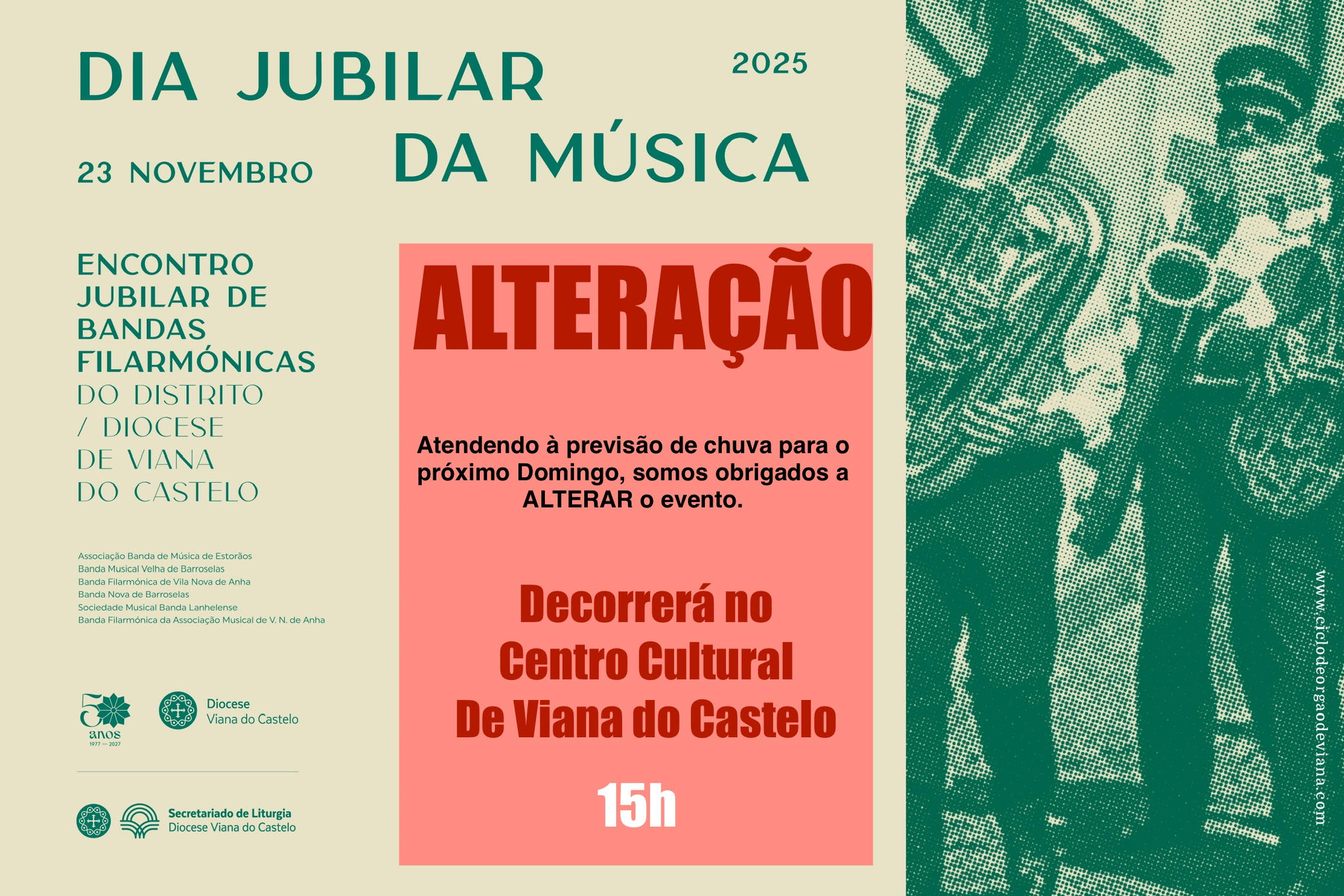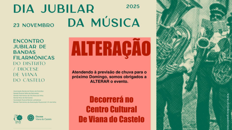 A organização do Encontro Jubilar de Bandas Filarmónicas no Dia Jubilar da Música 2025, que reúne diversas bandas filarmónicas do distrito e da Diocese de Viana do Castelo, anunciou uma alteração de última hora devido à previsão de chuva para o próximo domingo, 23 de novembro.