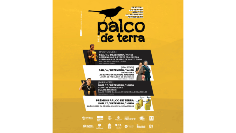 No domingo, pelas 10h30, os contos em mirandês, ou “Cuontas Mirandesas”, por Duarte Martins, encerram o cartaz que engloba também a atribuição dos Prémios Palco de Terra, no Salão Nobre da Câmara Municipal de Barcelos. Trata-se de galardões concedidos anualmente para reconhecer e agradecer o trabalho e o esforço de pessoas e instituições no âmbito do teatro realizado no meio rural, e da criação artística sobre o noroeste peninsular.